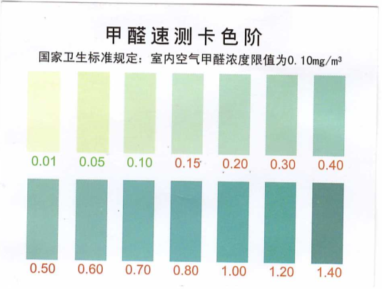 (6)對照比色卡進行比對。(國家衛生標準規定:室內空氣甲醛濃度限值為0.1mg/m3)。